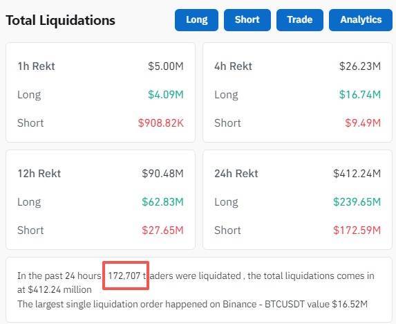由于剧烈震荡,据CoinGlass数据显示,近24小时内,加密货币共有超17万人爆仓。